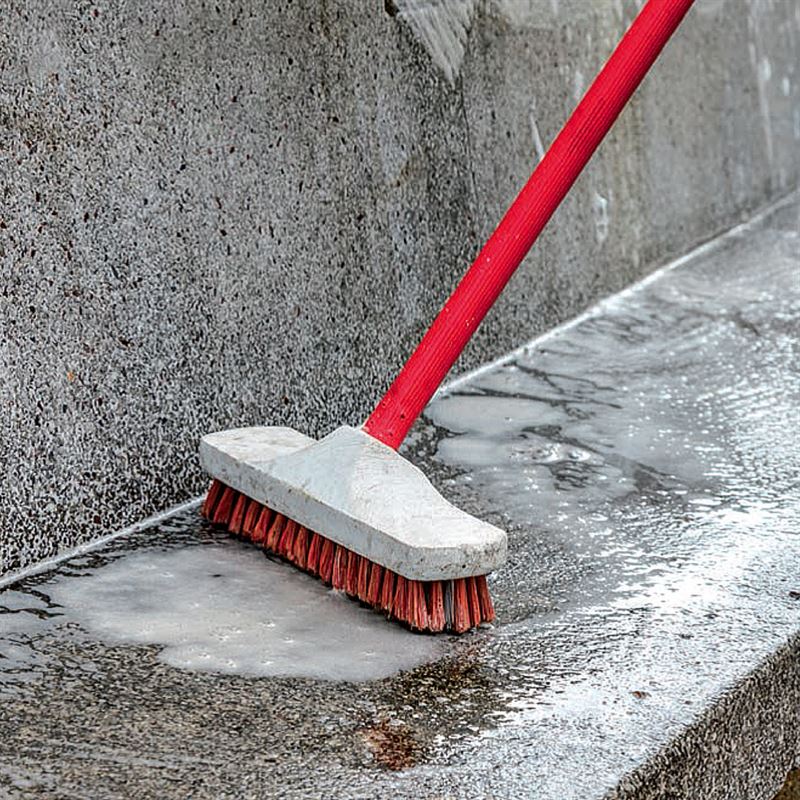 Don't dilute the product. Distribute onto the substrate using your broom, and leave to work for about 5-10 minutes depending on the level of dirt. Then, use a broom to scrub the surface (or a mechanical scrubber if you have one). Rinse with cold water and watch the grease float away.