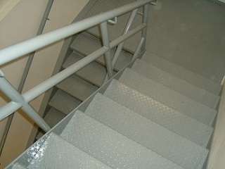 The before and after photographs show the standard galvanised steel staircase and following the application of type 'I' EdgeGrip Standard. The profiles were fitted using a combination of fast cure adhesive and stainless steel self tapping screws. The project, amounting to 624 steps, was completed, without any operational disruptions, in 4 days.