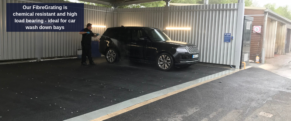 Our FibreGrating GRP open mesh grating is ideal for car wash down bays due to the high volumes of water easily filtering through the mesh, avoiding water build up and subsequent flooding. Its hard wearing and non-corrosive properties means it will be able to withstand high vehicle traffic and any potential surface damage caused from chemicals in cleaning products. The load bearing capabilities also allow it to withstand heavy vehicles.