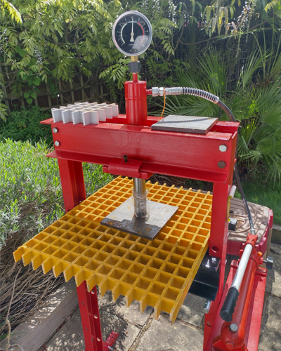 One of the key benefits of FibreGrid's GRP Grating panels is the high strength-to-weight ratio. A customer decided to run our 38mm GRP Grating though a hydraulic press test and show us the results.
