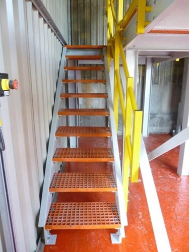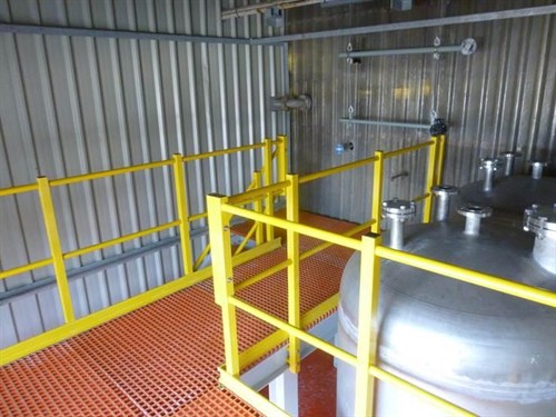 The tanks contain Phosphorous Trichloride (PCl₃) which generates hydrochloric acid - a particularly harmful chemical on contact with water; so the whole structure needed to be acid resistant in case of a leak, hence the reason why FibreGrid's vinyl ester resin was used to withstand the highly corrosive chemical environment. FibreGrid provided the client with a bespoke, lightweight, pre-engineered composite GRP access platform. The platform fitted perfectly with no additional modifications required. A removable handrail section was included to allow easy access to the drums.