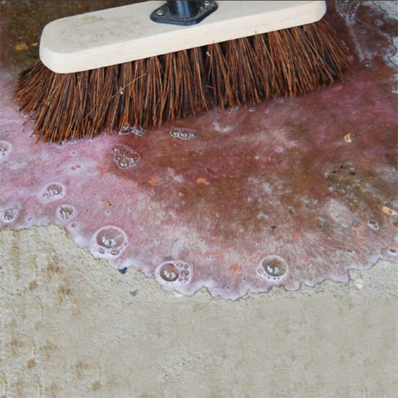 Give the area a good scrub with a stiff brush or mechanical cleaner. Wait for about 15 minutes, during which time you will see the product fizzing away as it gently eats into the concrete. When it has stopped fizzing, wash off with lots of cold water. The concrete should look cleaner and whiter and like it is ready for painting.