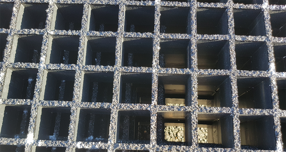 As standard, our Square Mesh grating comes with a grit top to provide an anti slip surface. There is also a choice between our Standard and Heavy Duty Square Mesh Grating, in that our Standard Grating has a post-cure grit top, whereas our Heavy Duty Grating has embedded grit, making the grit more heavy duty and long-lasting with a higher slip resistance value.