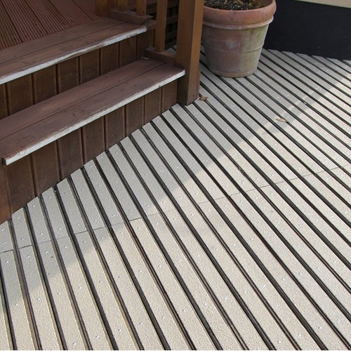Our best solution to slippery decking is the Anti Slip GRP Decking Strips, due to the ease and speed at which they can be installed. With the addition of pre-drilled holes and fixing screws, simply screw into your existing timber decking. It can then be walked on immediately, minimising disruption and is ready to provide 70 PTV when dry and 65 PTV when wet.